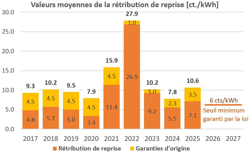 De 2017 à 2024, BKWet La Goule ont rétribué l'injection à 12.5 ct./kWh en moyenne, garanties d’origine (GO) inclues, voir ci-dessous. L’ordonnance fédérale sur l’énergie (OEne) fixe dès 2026 une rétribution-plancher de 6 ct./kWh pour les installations jusqu’à 30 kWc, auxquels s’ajoutent les GO, actuellement à 3.5 ct/kWh chez BKW et La Goule.